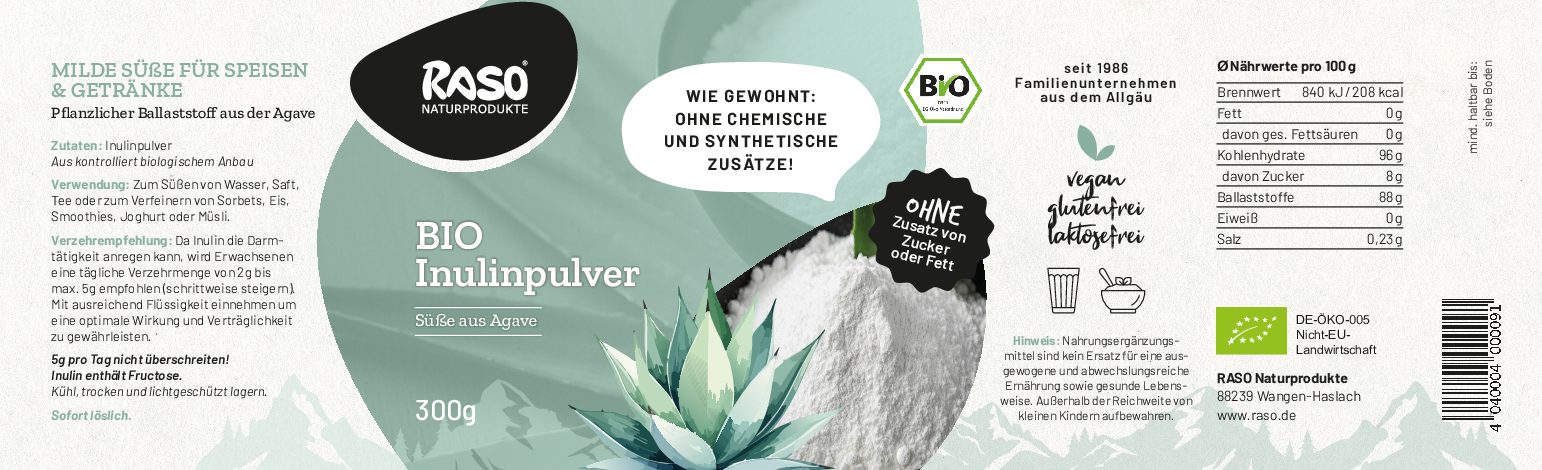 Unser Bio Inulin Pulver ist ein natürlicher, löslicher Ballaststoff aus kontrolliert biologischem Anbau 🌱. Es wird schonend aus der Agave gewonnen und anschließend bei RASO Naturprodukte im Allgäu in praktischen Dosen abgefüllt – in der 60 g Streudose oder der 300 g Vorratsdose.